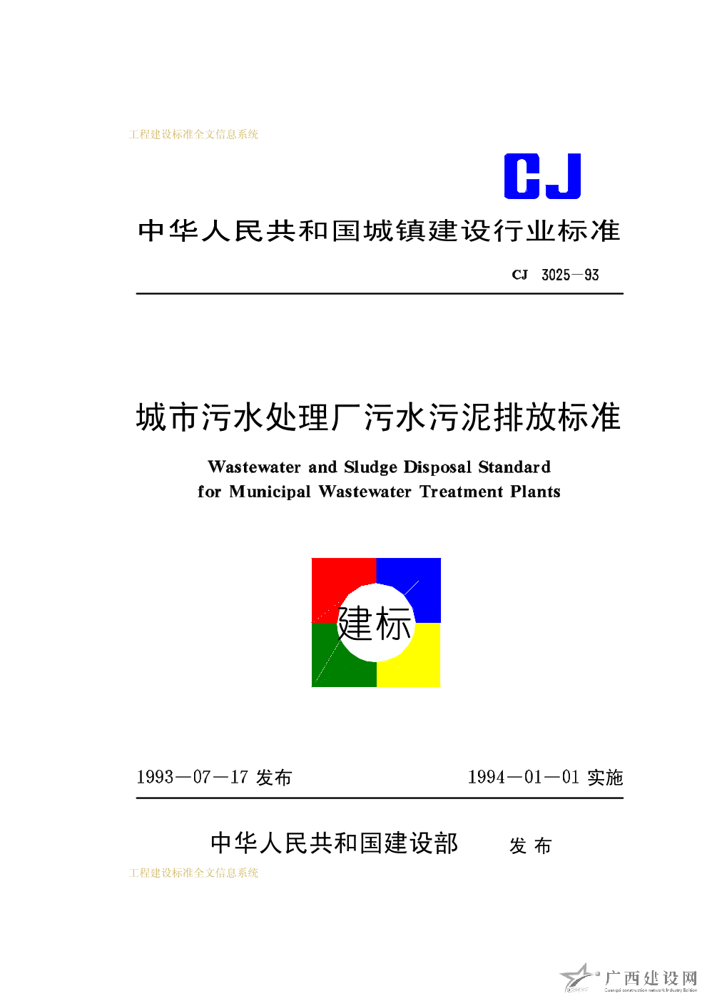 城市污水處理廠污水污泥排放標(biāo)準(zhǔn) CJ3025-93