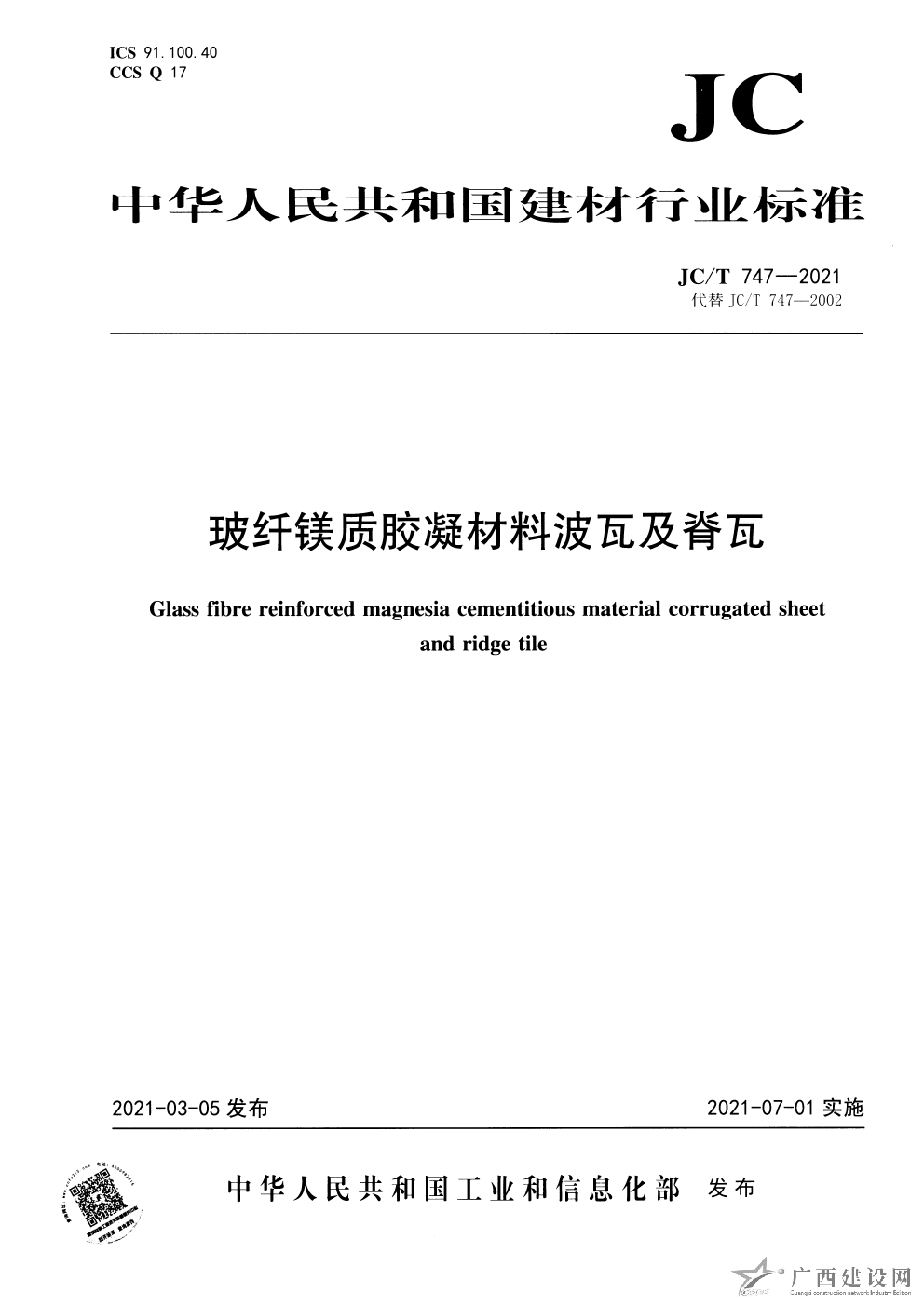 JC T 747-2021 玻纖鎂質(zhì)膠凝材料波瓦及脊瓦