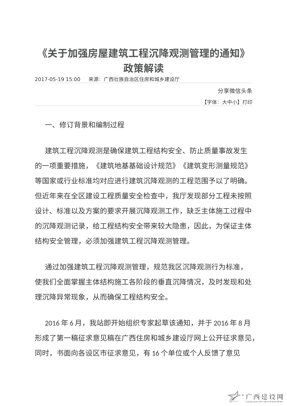 建筑工程沉降觀測是確保建筑工程結構安全、防止質量 事故發生的一項重要措施,《建筑地基基礎設計規范》《建 筑變形測量規范》等國家或行業標準均對應進行建筑沉降觀 測的工程范圍予以了明確。但近年來在全區建設工程質量安 全檢查中,我廳發現部分工程未按照設計、標準以及方案的 要求開展沉降觀測工作,缺乏主體施工.......