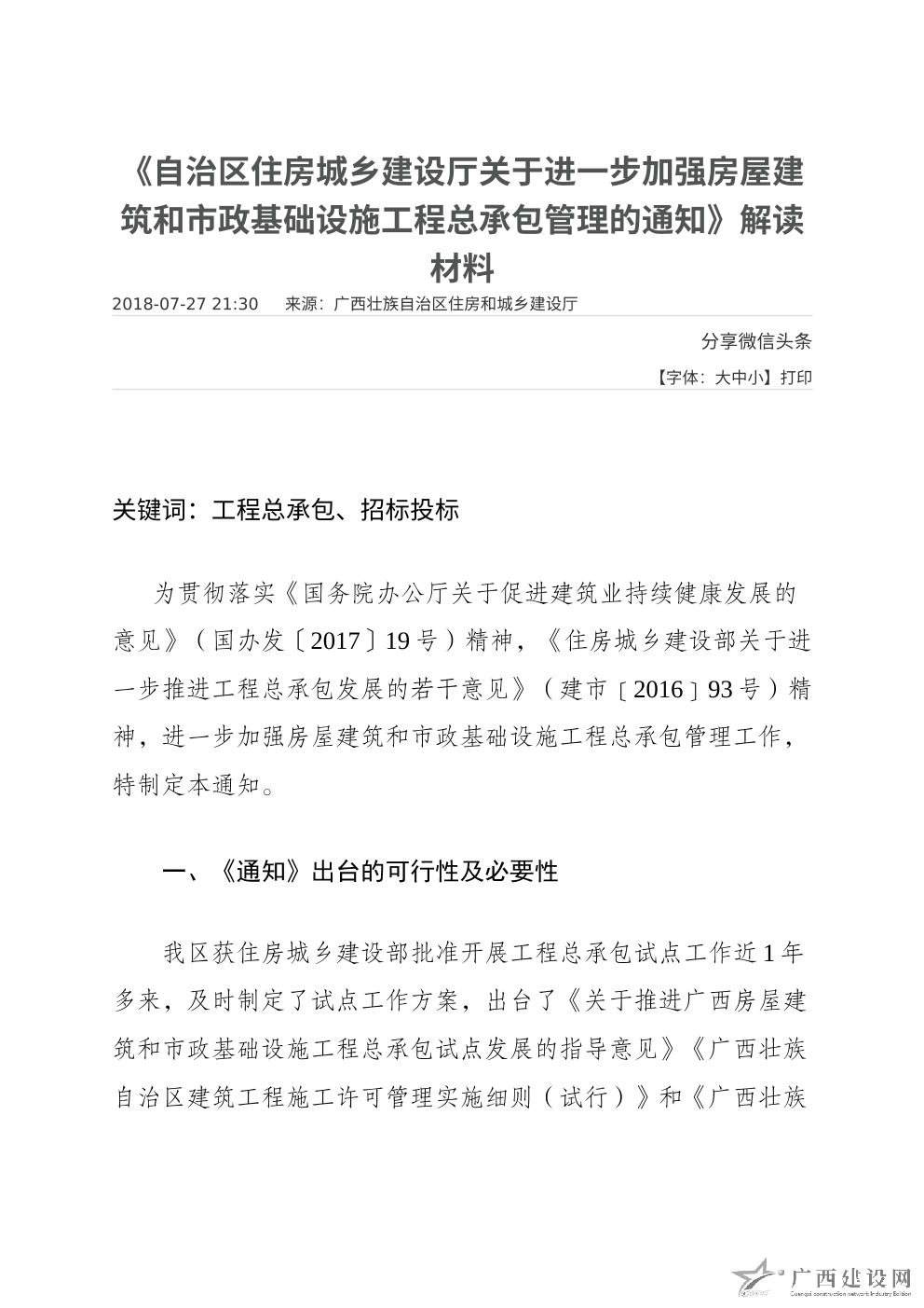 《自治區住房城鄉建設廳關于進一步加強房屋建筑和市政基礎設施工程總承包管理的通知》解讀材料