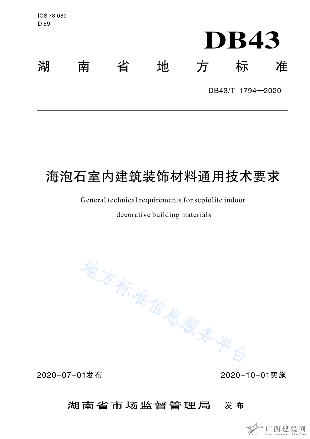 DB43 T1794-2020海泡石室內(nèi)建筑裝飾材料通用技術(shù)要求