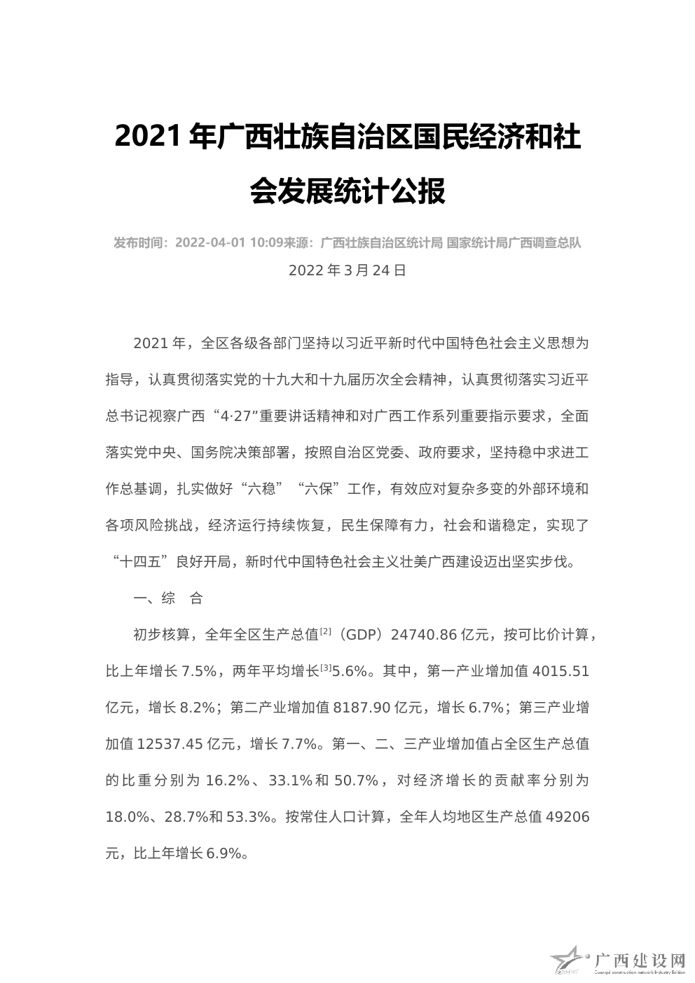2021年廣西壯族自治區(qū)國(guó)民經(jīng)濟(jì)和社會(huì)發(fā)展統(tǒng)計(jì)公報(bào)