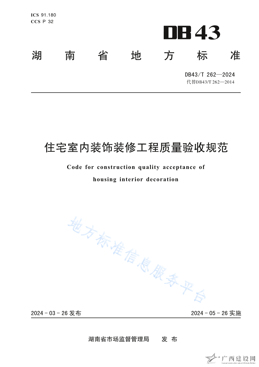 DB43T 262-2024住宅室內裝飾裝修工程質量驗收規范