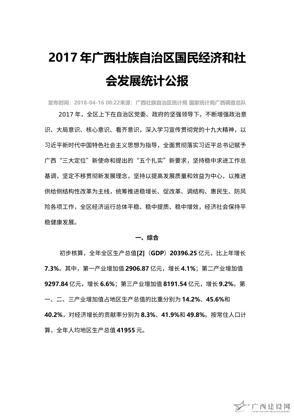 2017年廣西壯族自治區(qū)國民經(jīng)濟(jì)和社會發(fā)展統(tǒng)計(jì)公報