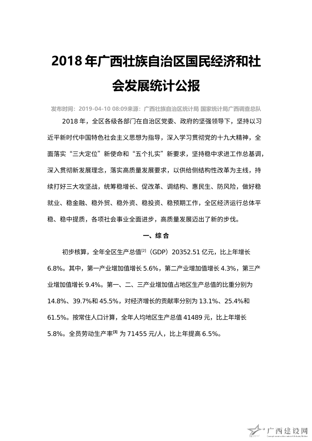 2018年廣西壯族自治區(qū)國民經(jīng)濟(jì)和社會發(fā)展統(tǒng)計(jì)公報