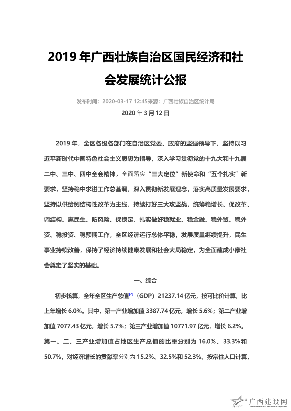 2019年廣西壯族自治區(qū)國民經(jīng)濟(jì)和社會發(fā)展統(tǒng)計(jì)公報