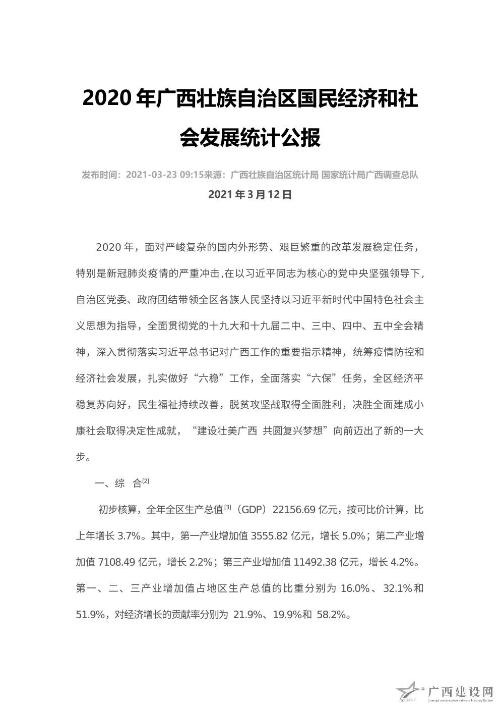 2020年廣西壯族自治區(qū)國民經(jīng)濟(jì)和社會發(fā)展統(tǒng)計(jì)公報