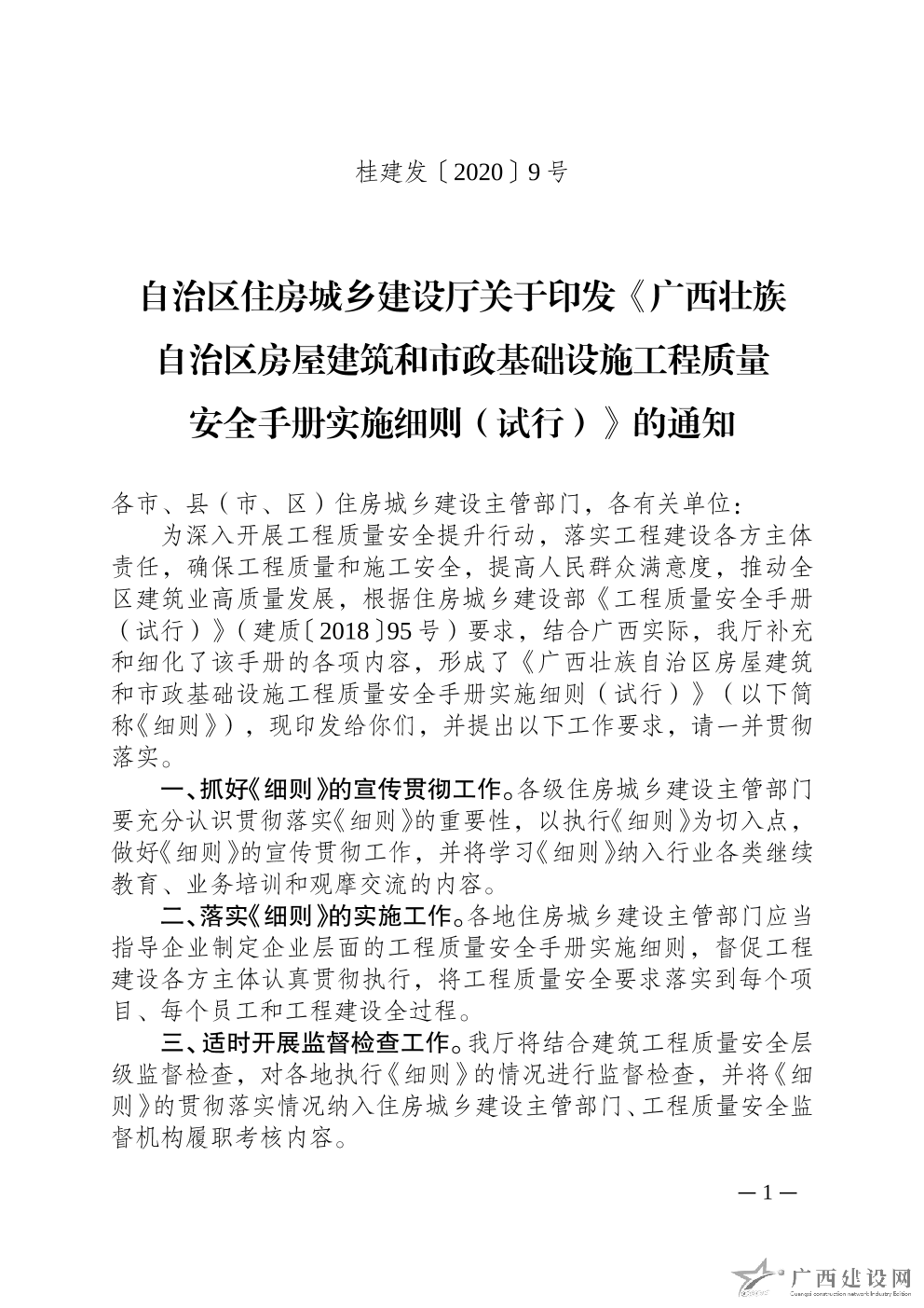 《廣西房屋建筑和市政基礎設施工程質量安全手冊實施細則》政策解讀材料