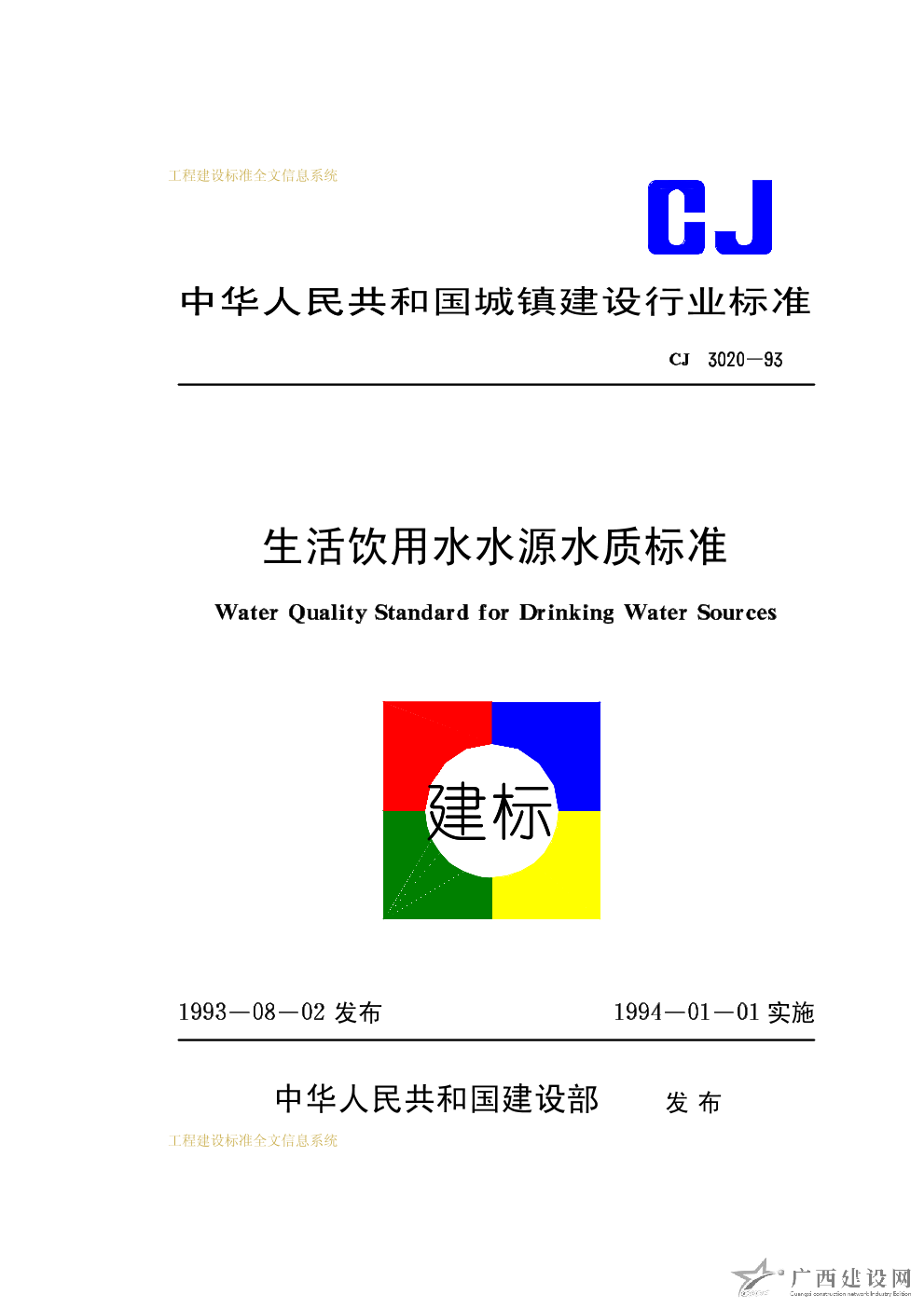 生活飲用水水源水質(zhì)標(biāo)準(zhǔn) CJ3020-93