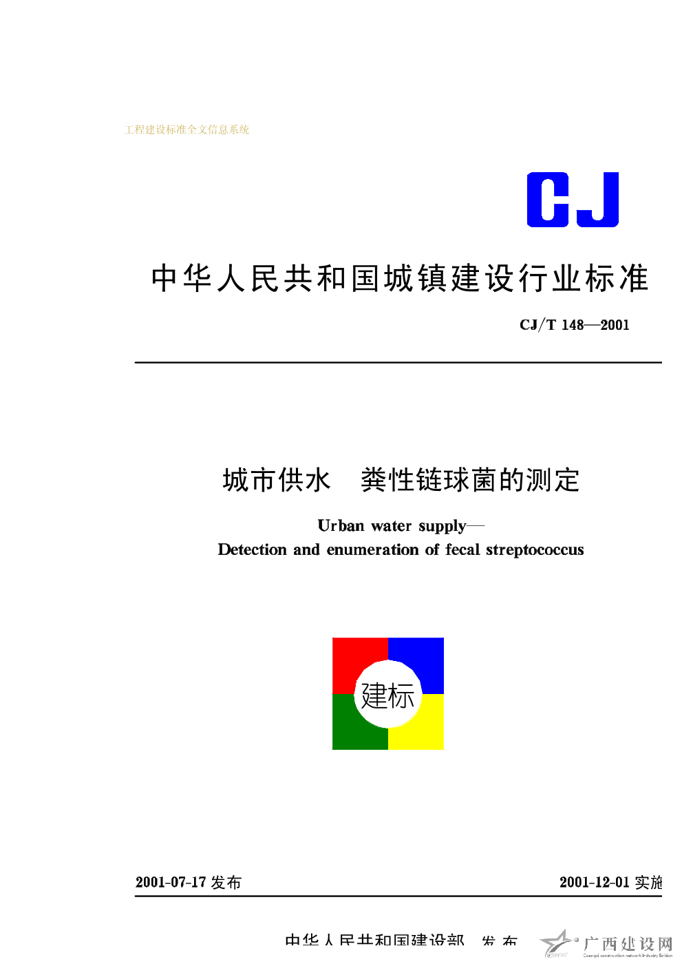 城市供水 糞性鏈球菌的測定 CJ/T 148—2001