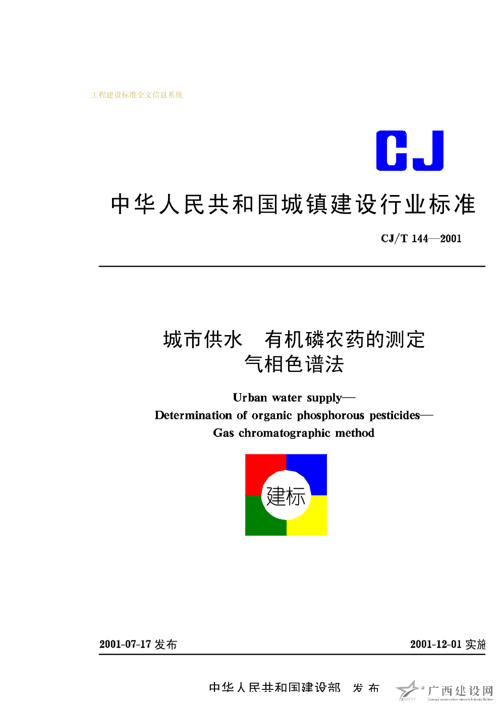 城市供水 有機磷農藥的測定氣相色譜法 CJ/T144—2001