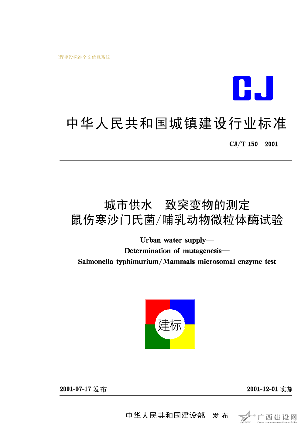 城市供水 致突變物的測定鼠傷寒沙門氏菌/哺乳動物微粒體酶試驗 CJ/T150—2001