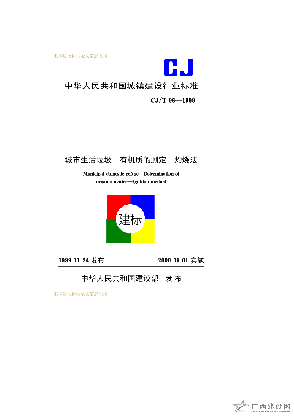 城市生活垃圾有機質的測定灼燒法 CJ/T96—1999