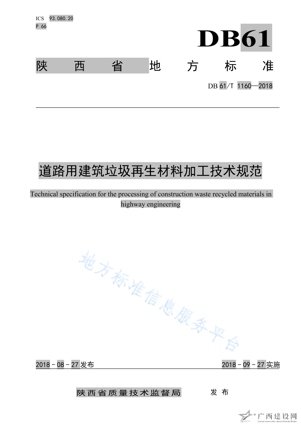 DB61 T1160-2018道路用建筑垃圾再生材料加工技術(shù)規(guī)范