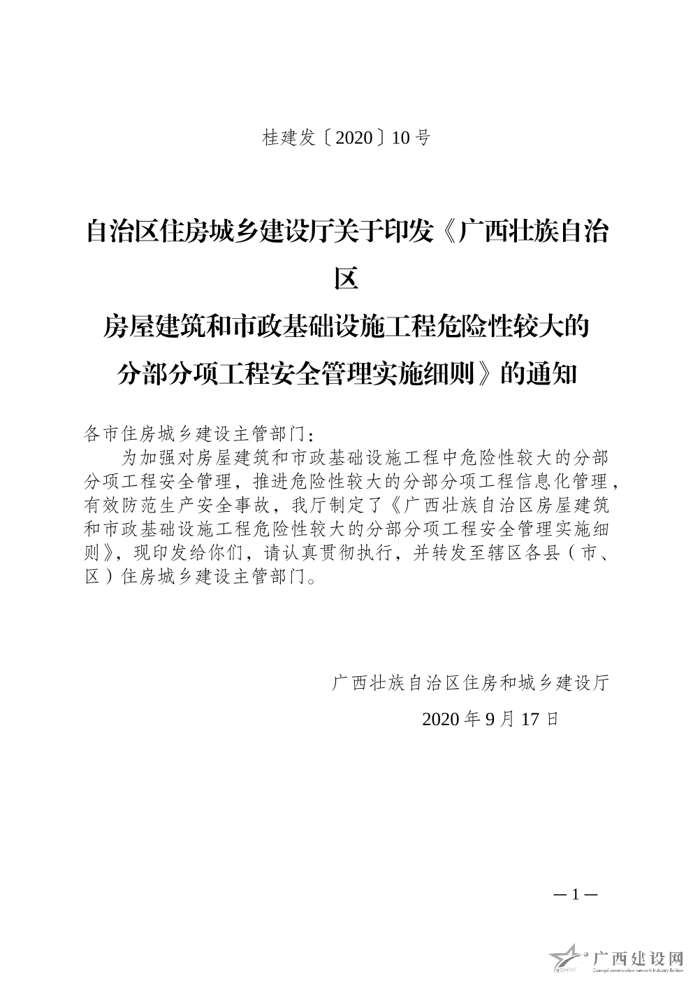 《廣西壯族自治區(qū)房屋建筑和市政基礎(chǔ)設(shè)施工程危險(xiǎn)性較大的分部分項(xiàng)工程安全管理實(shí)施細(xì)則》(桂建發(fā)【2020】10號(hào))的通知
